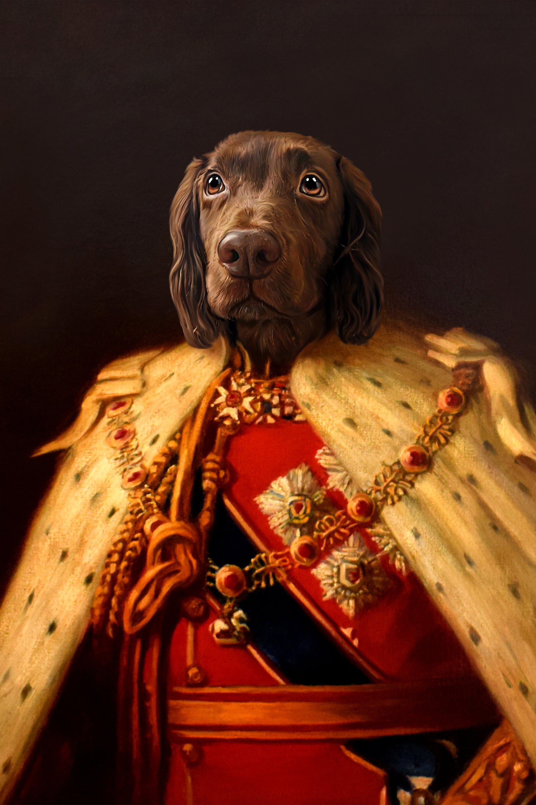 Elevate your pet's status with a Royal Pet Portrait, crafted in a timeless oil painting style. Our custom portraits transform your beloved pet into a regal figure, capturing their majestic essence in a unique and captivating way. Each oil pet portrait is meticulously created from a photo, offering a personalised and sophisticated piece of art that will be cherished forever. Perfect for adding a touch of royalty to your home or as a unique and thoughtful gift for pet lovers.