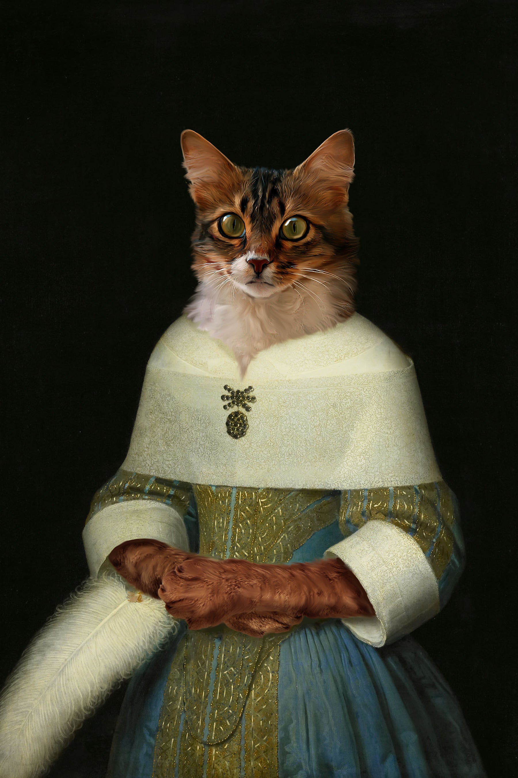 - Personalised Royal Pet Portrait: Each portrait is custom-made, depicting your pet in a regal attire inspired by classical portraiture, ensuring a one-of-a-kind artwork.