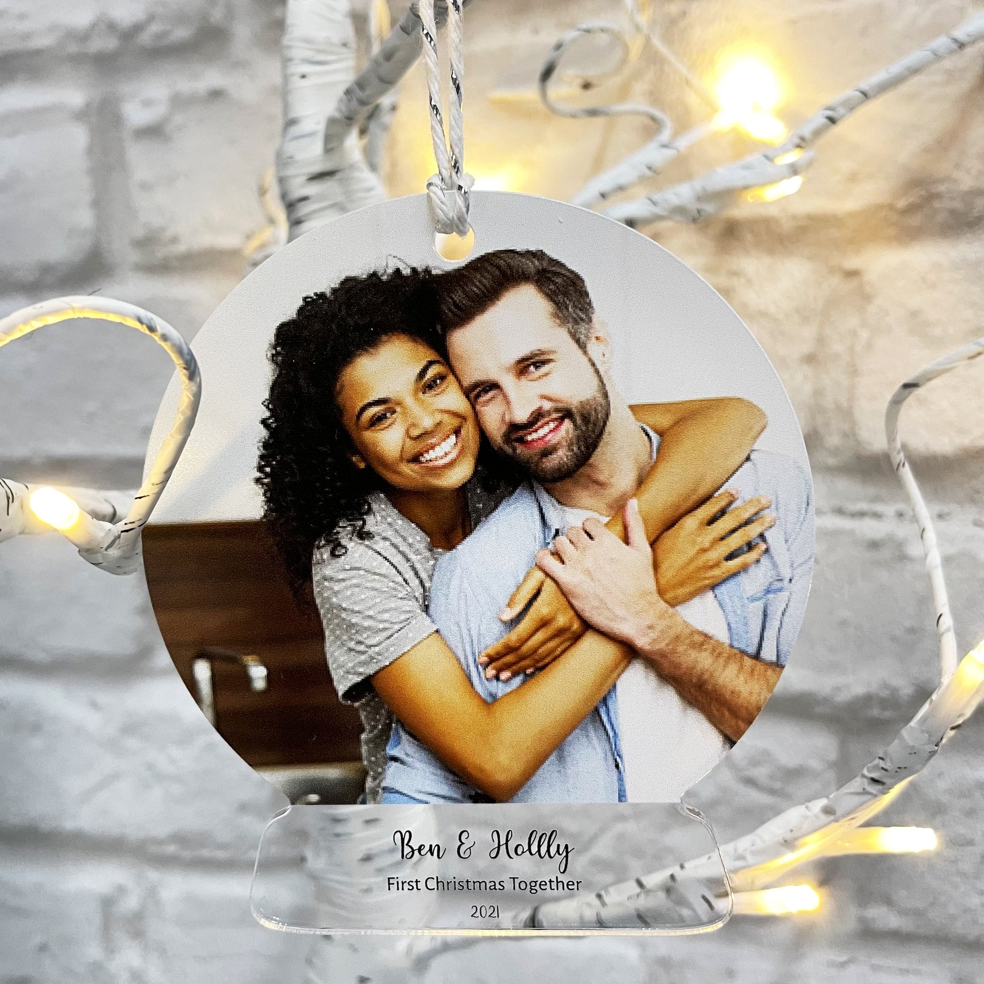 Brighten up your tree to remember your First Christmas Together with this lovely personalised Photo bauble. Display this keepsake on your tree year after year to remember a special moment.